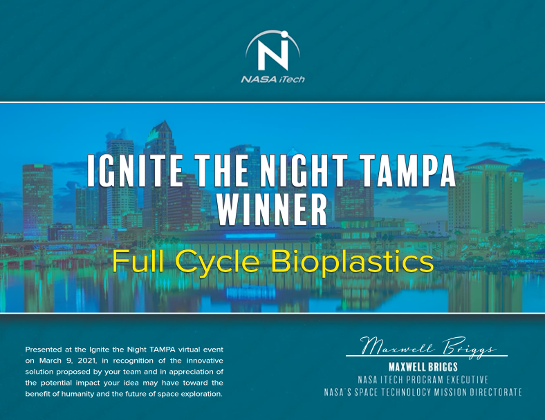 Full Cycle won the March 9, 2021 pitch competition, judged by Chief Technologists at NASA. I authored our application, developed our pitch video, and participated in Q&A with Co-Founder and Co-CEO, Dane Anderson. View the pitch and Q&A below.