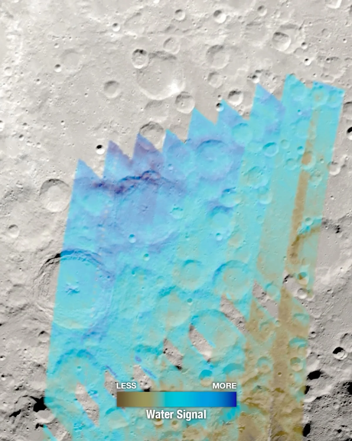 The SOFIA observation, visualized as it appeared on February 17, 2022, is “shown in shades of blue (stronger water signal) and brown. The visualization includes a color key and latitude-longitude grid near the South Pole. This is a vertical aspect ratio version.”